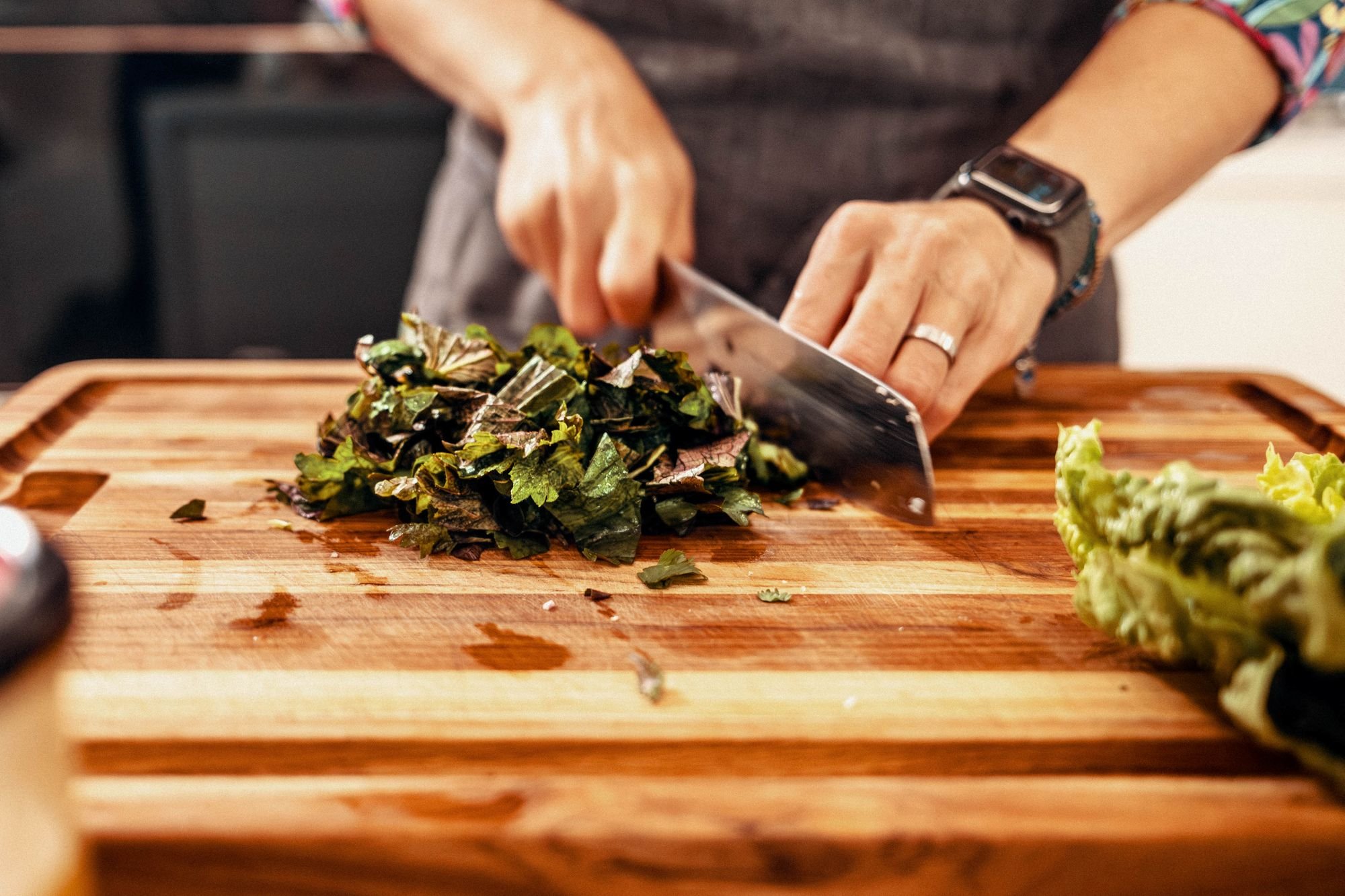 Jednu hrst čerstvého koriandru nasekejte nahrubo stejně jako zbytek bylinek a promíchejte tak, aby vznikla bylinková směs. Druhou hrst koriandru pokrájejte stejně, ale nechte stranou zvlášť.
