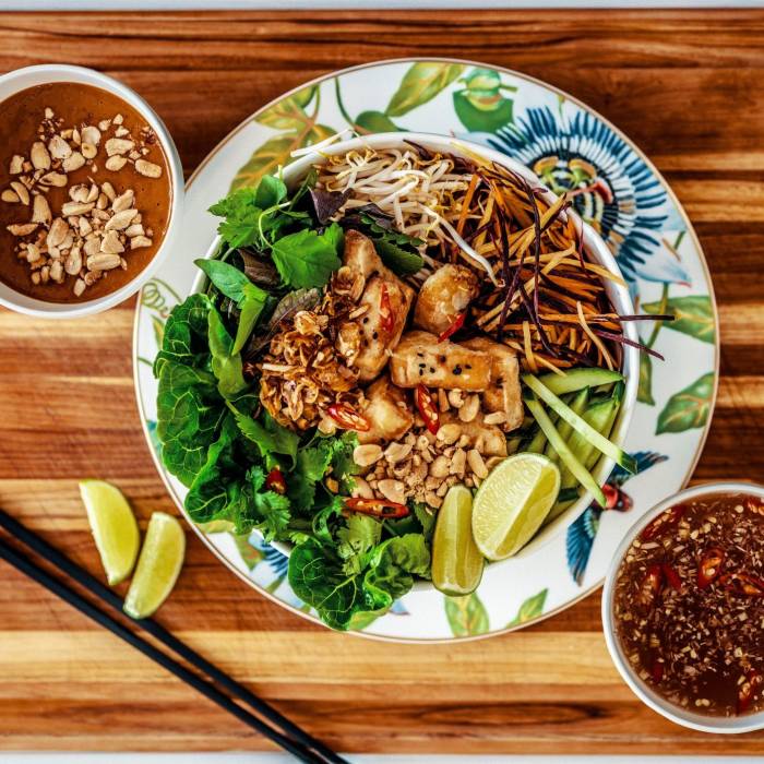 Tofu dejte do středu misky na poslední volné místo na nudlích. Přidejte lžíci čerstvě restované cibulky, voňavých arašídů a vše zalijte zálivkou. Pokud máte rádi pálivé přidejte chilli, případně omáčku Sriracha nebo Hoisin.